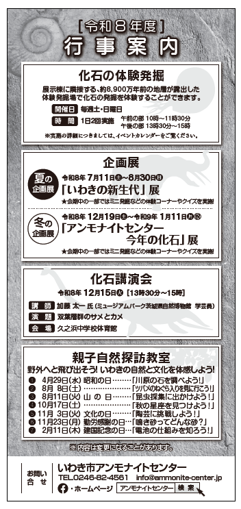 小・中学校の夏休み期間においては、いわき市から産出する化石や地質学の魅力を伝え、利用者の自由研究等に対するニーズにも資する展示を実施します。