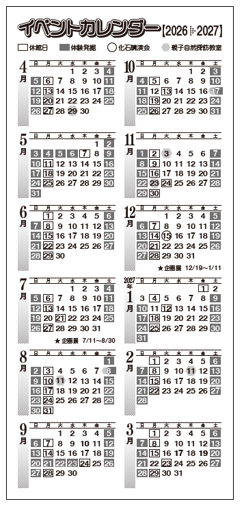 年7回開催しているイベントで、古生物学以外にも自然科学分野全般にわたって広範なテーマでの体験学習カリキュラムの提供を通し、理科への興味と知識を育みます。