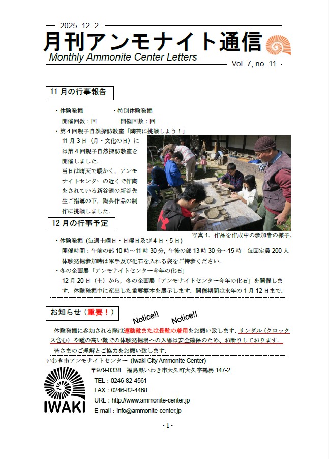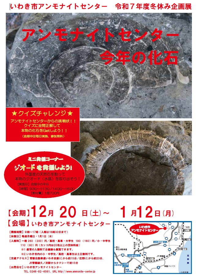 年末にかけて多くの方々に来館していただいており、現在千円札が足らない状況となっております。来館される際は、千円札のご準備をよろしくお願いいたします。アンモナイトセンターでは現金以外はご使用できませんのでご注意願います。